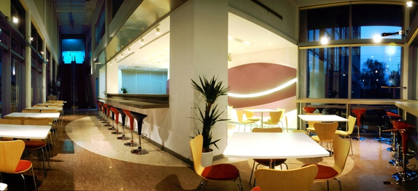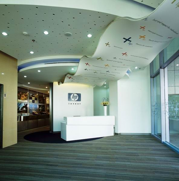首先映入我們眼簾的第一件辦公家具是其前臺辦公桌,潔白的前臺和墻壁顯得整潔大方,沒有多余的瑕疵,從而與后墻的惠普logo相互襯托,突出了logo的重要性。除此之外,天花板十分有特色:上面有條波浪狀的板塊,就像一條銀河,而旁邊的天花板部分則有各種大小不一的小孔和電燈裝飾,看起來就像夜空中的繁星,組合在一起就像浩瀚的宇宙,象征著惠普美好的愿景和向往。