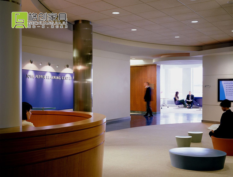 設(shè)計(jì)團(tuán)隊(duì)運(yùn)用大量圓弧造型,從天花板上的弧線到圓形的地毯,再到起到支撐作用的圓柱、同樣造型的接待臺(tái)和桌椅,都運(yùn)用了中的呼應(yīng)手法,并使整個(gè)空間顯得柔和、圓潤(rùn),給人一種親切之感,符合寶潔公司日化路線的定位。