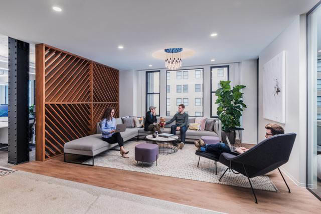 在這個(gè)非正式、無(wú)階層的辦公環(huán)境里,自然沒(méi)有傳統(tǒng)的接待臺(tái),取而代之的是家居客廳般的接待區(qū)。沿窗布局的工作區(qū)配以升降桌系統(tǒng),這里日光充足,視野開闊,協(xié)作區(qū)與工作區(qū)交織在一起,促進(jìn)更高效的合作與交流。
