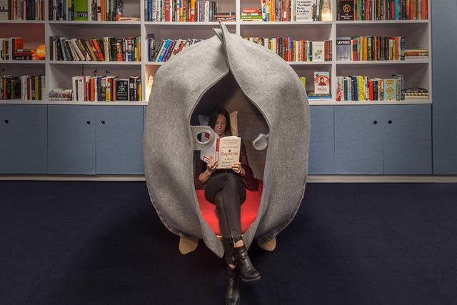 工作上總會(huì)遇到各種各樣不開(kāi)心的事,不是嗎?因此設(shè)計(jì)師將一間舊的文檔室改造成圖書(shū)冥想室,并配以超級(jí)有趣的神器:HUSH Pod繭式豆莢,一個(gè)人躲在里面可以發(fā)泄郁悶或憤怒情緒。