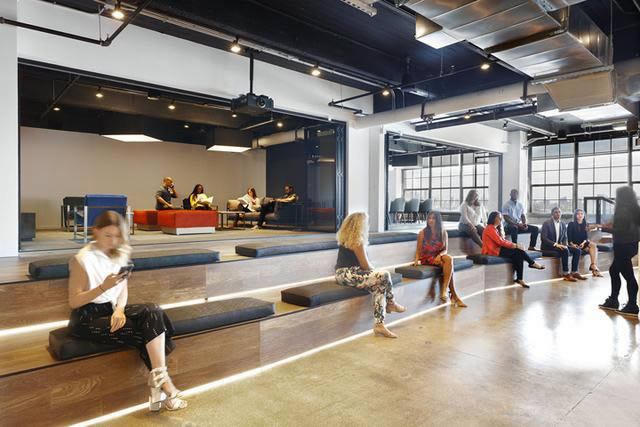 設(shè)計團隊以開放式空間布局最大化利用室外陽光,以及開闊的城市景觀視野,以弱化最密集布局的銷售部門。此外還設(shè)計了大量協(xié)作會議空間、電話亭,以及一間視頻編輯室。